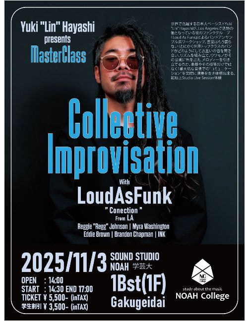世界で活躍する日本人ベーシストYuki "Lin" Hayashiが、Los Angelesで活動の軸となっている彼のファンクグループ『Loud As Funk』によるバンドアンサンブル系ワークショップ。